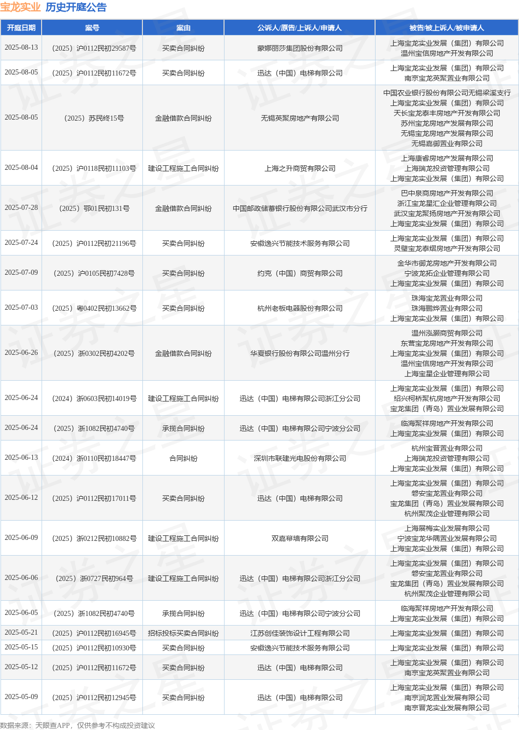 案号:(2024)浙0603民初14019号审理法院:绍兴市柯桥区人民法院案由:建设工程施工合同纠纷当事人信息: 原告/上诉人:迅达(中国)电梯有限公司浙江分公司 被告/被上诉人:上海宝龙实业发展(集团)有限公司、绍兴柯桥聚杭房地产开发有限公司、宝龙集团(青岛)置业发展有限公司开庭日期:2025年6月24日根据统计,近一年内以上海宝龙实业发展(集团)有限公司为当事人的历史开庭公告有125则,其中案由为“买卖合同纠纷”的公告以76则居首,其次为“金融借款合同纠纷”有10则,“建设工程施工合同纠纷”有8则。历史开庭公告(前20条)如下: